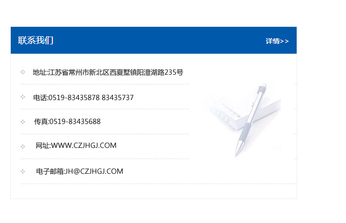 地址:常州市新北區友邦商務大廈1幢16、17層  電話:0519-85101652  傳真:0519-85112595  郵編:213022  網址:www.cz-jiayue_cn.lfsy9.com  郵箱:xiajifengaa@163.com